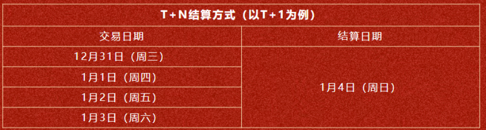 根据《国务院办公厅关于2026年部分节假日安排》的通知,针对商户元旦假期期间T+N交易结算具体安排如下,其余交易不受影响。
